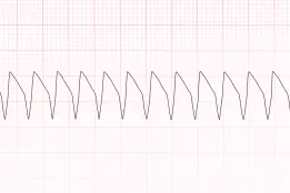 Pulseless ventricular tachycardia (VT) and Ventricular fibrillation (VF) are life-threatening cardiac rhythms that result in ineffective ventricular contractions. The ventricular motion of VF is not synchronized with atrial contractions. VT or VTach (Figure 24) is a condition in which the ventricles contract more than 100 times per minute. VF or VFib (Figure 23) is a rapid quivering of the ventricular walls that prevents them from pumping. The emergency condition, pulseless VT, occurs when ventricular contraction is so rapid that there is no time for the heart to refill, resulting in undetectable pulse. In both cases, individuals are not receiving adequate blood flow to the tissues. Despite being different pathological phenomena and having different ECG rhythms, the ACLS management of pulseless VT and VF are essentially the same. Pulseless VT and resuscitation for VF starts with the BLS Survey.