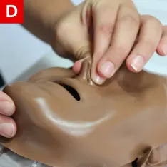 - Hold the child’s airway open as described above and pinch their nose shut (Figure 20d).