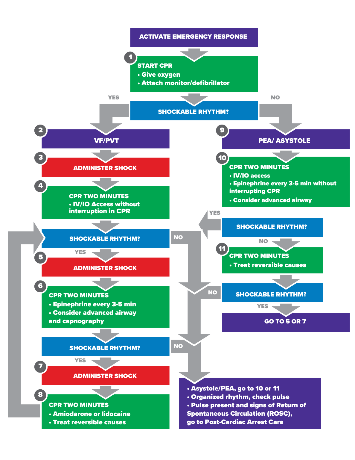 - Rapid Defibrillation: Using appropriate energy doses for defibrillation when ventricular fibrillation or pulseless ventricular tachycardia is present.