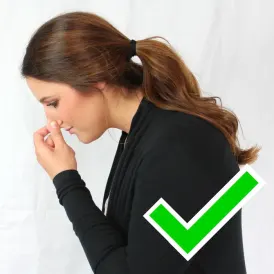 After ensuring that the scene is safe and protective equipment is on, press both sides of the nostrils just below the bony portion of the nose for a minimum of 5 to 10 minutes. If bleeding continues, try holding pressure for an additional 10 minutes. Sit upright and lean your body and your head slightly forward. This will keep the blood from running down your throat, which can cause vomiting. (Do NOT lay flat or put your head between your legs.) If bleeding continues after this, seek further medical care. If the victim has trouble breathing or shows signs of severe distress, call 911/EMS.