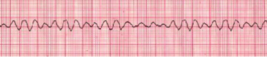 The patient remains unresponsive and pulseless. The initial rhythm on the monitor demonstrates the following:
